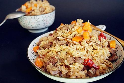 手抓饭是新疆菜品,具有色、味、香俱全的特点。是维吾尔族的上等饭,一般家里有喜事或贵客上门,主人就会做这种饭来招待客人。主要的原料是新鲜羊肉,胡萝卜、洋葱、清油、羊油和大米。做法是先将羊肉剁成小块用清油略炸,然后再放洋葱和胡萝卜在锅里炒,并酌情放盐加水。等二十分钟食材软化后,再把洗泡好的大米放入锅内,码好后不要搅动,四十分钟后,抓饭即熟。适时将锅内的所有食材彻底翻动搅拌均匀,再加上酸辣的凉拌菜就可以食用啦。做熟的抓饭油亮生辉,味香可口,营养丰富,在新疆把抓饭视为迎接客人最好的美食。