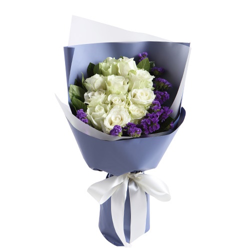 雪山白玫瑰11枝,搭配适量紫色勿忘我栀子叶