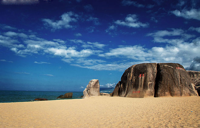 天涯海角游览区,位于三亚市区西南23公里处,陆地面积10.4平方公里,海域面积6平方公里,背负马岭山,面向茫茫大海,是海南建省20年第一旅游名胜。这里海水澄碧, 烟波浩瀚,帆影点点,椰林婆娑,奇石林立水天一色。海湾沙滩上大小百块石耸立,“天涯”、“海角”和“南天一柱”巨石突兀其间,昂首天外,峥嵘壮观。沙滩上大小百块磊石耸立,上有众多石刻。清康熙五十三年(1471年)钦差大臣苗曹汤巡边至此,勒石镌字“海判南天”,这是天涯海角最早的石刻。