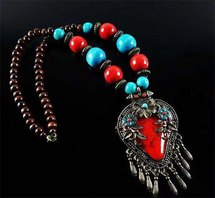 藏族特色的项链有很多种,最常见的是以绿豆大小的珠子串成,材料一般为松石、玛瑙、蜜蜡、青金石、檀木、藏银等,颜色多为红色,绿色、黄色、白色,串成项链的珠子的数量没有特殊要求,但是很多都以108颗为准,这与藏传佛教中108颗佛珠代表108种烦恼或者108尊佛的功德有关。