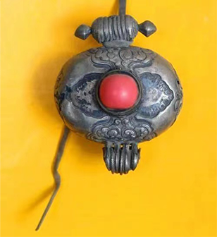 项链一般是由珊瑚翡翠、松耳石、九眼珠组成。有的还要在其中一串项链的中间串一个小护身盒。护身盒:妇女使用的护身盒一般都比较小巧,有方的圆的扁圆的,上面镶有珊瑚和翡翠。护身盒又叫嘎乌盒,从来源来说,“嘎乌”是藏语的音译,指护身的盒子,由佛盒演变而来,原初它是表达对佛的虔诚,后来越做越精巧,成为人们喜爱的服饰。藏族妇女尤其喜欢用嘎乌等饰品装扮自己,显得更加妩媚动人。它是不分男女老少、佩戴较多的装饰物。嘎乌的形状有方也有圆,一般来说,男子用方的,女子用圆的,挂在脖子上。