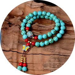 绿松石,又称“松石”,因其“形似松球,色近松绿”而得名。古人称其为"碧甸子"、"青琅秆"等等,绿松石是古老宝石之一,作为佩戴和使用已有5000年以上的历 史。中国主产地湖北、安徽、陕西、河南、新疆。西藏没有任何矿口,但是每个藏族人民的身上都佩戴绿松石。这是藏族人民的一种配饰,也是一种文化和信仰。许多藏 族人颈脖上都戴有系着一块被视为灵魂的绿松石的宝石项链,妇女将她们的头发梳成108个小辫,辫上饰以绿松石和珊瑚。对藏南的已婚妇女来说,头发上佩戴绿松石表 达了对丈夫长寿的祝愿,而头发上没有任何绿松石饰物被认为是对丈夫的不敬。科学意义上讲绿松石属于磷酸盐矿物。天然绿松石工艺名称为“松石”,因其形似松球且 色近松绿而得名。绿松石还被用于第一个藏王的王冠,用作神坛供品以及藏王向居于高位的喇嘛赠送的礼品及向邻国贡献的贡品。在上世纪拉萨贵族所戴的珠宝中,金和 绿松石仍是主要的材料。绿松石是十二月的诞生石。被认为是爱情的魅力;若爱人不忠诚的话,它的颜色会改变。若它的配戴者濒临死亡,它仍然代表着友谊及忠诚。如 果你发觉它的色彩变淡,只要远离它几星期後又会回复其光辉。绿松石能带来成功及幸运,尤其与蓝宝石一起配戴。绿松石能促进细胞再生 避免受到污染物污染强壮身体。象征 —— 成功 吉祥 富贵 平安.
