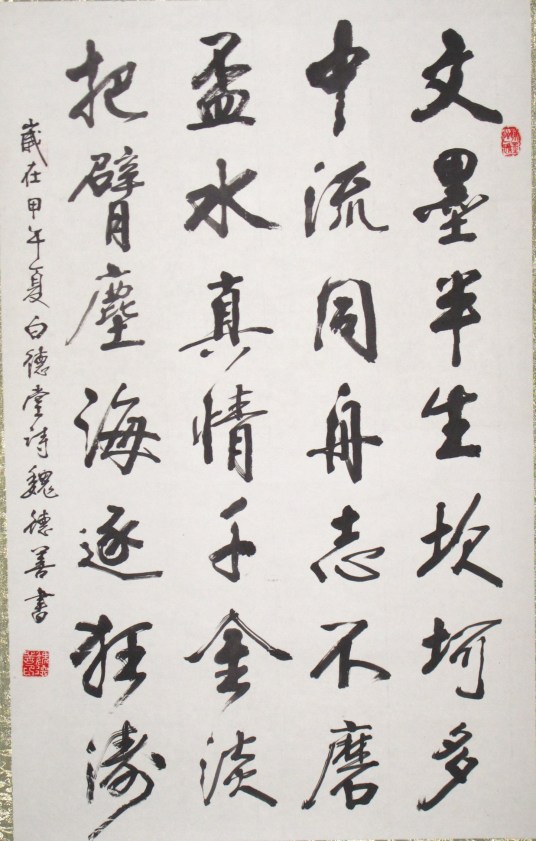 行书,是一种书法统称,分为行楷和行草两种。它在楷书的基础上发展起源的,是介于楷书、草书之间的一种字体,是为了弥补楷书的书写速度太慢和草书的难于辨认而产生的。“行”是“行走”的意思,因此它不像草书那样潦草,也不像楷书那样端正。实质上它是楷书的草化或草书的楷化。楷法多于草法的叫“行楷”,草法多于楷法的叫“行草”。行书实用性和艺术性皆高,而楷书是文字符号,实用性高且见功夫;相比较而言,草书则是艺术性高,但是实用性显得相对不足。
