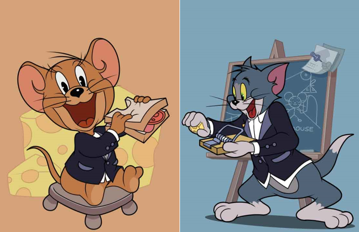 猫和老鼠》的故事情节围绕着一对常见的家猫汤姆和老鼠杰瑞而展开,汤姆有一种强烈的欲望,总是不断努力的去捉同居一室的老鼠杰利,并不断地努力驱赶着这位讨厌的房客。尽管总是失败,但汤姆在追逐中得到的乐趣远远超过了捉住杰瑞。同时,汤姆在片中经常使用斧头、锤子、炸药、鞭炮等暴力工具或陷阱来对付杰瑞。但杰瑞非常机灵,时而使汤姆的诡计适得其反,让汤姆自食其果。在这部动画中,没有动物世界中恃强凌弱的残酷,只有两个邻居之间的日常琐事和纷争