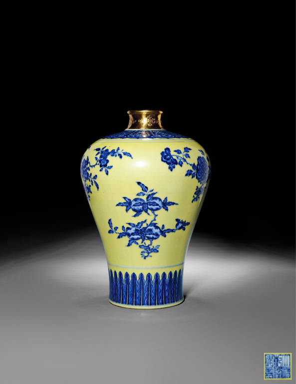 本品丰肩长胫,器型丰腴挺拔,为标准乾隆梅瓶造型。通体纹饰以青花绘就,肩部及近足处分饰莲瓣与蕉叶纹,腹部主体满绘折枝花果纹,石榴、寿桃、荔枝搭配梅花、莲花等吉祥花卉,布局舒朗,画意精湛,绘工考究,多处以重笔点染,有刻意模仿永、宣青花苏麻离青之效果,发色艳丽有加。青花纹饰间空隙处以黄釉填满,色泽娇嫩可人,填涂一丝不苟。黄蓝两色,一明一暗,给人以强烈的视觉冲击。瓶底心青花书“大清乾隆年制”六字三行篆书款。黄地青花以青花和黄釉为饰,系经二次施釉,两次烧成。
