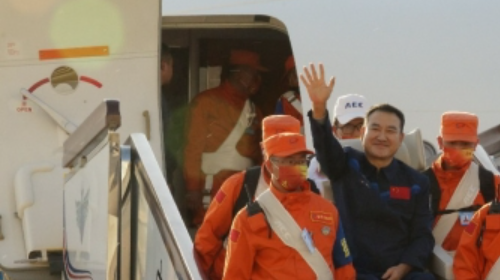 圆满完成神舟十三号载人飞行任务的航天员翟志刚、王亚平、叶光富,于2022年4月16日...