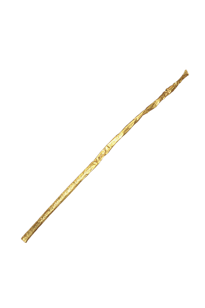 三星堆祭祀坑出土的金杖是已出土的中国同时期金器中体量最大的一件。金杖系用金条捶打成金皮后,再包卷在木杖上;出土时木杖已炭化,仅存金皮,金皮内还残留有炭化的木渣。