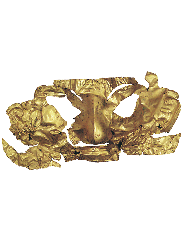 金面罩以金箔捶拓而成,双眼镂空,鼻部凸起,中有锋棱,制作工艺精良。其大小与同坑出土的人头像面部比例基本吻合,可相匹配。估计可能原是附贴在某件人头像面部。