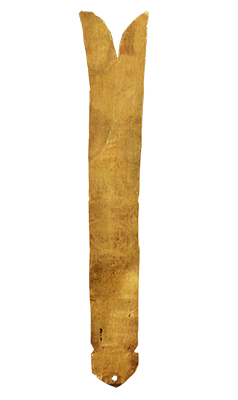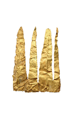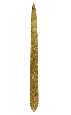 器物呈柳叶形,头端圆而尖,有一圆穿孔,两侧各有一缺口,缺口之前各有一小圆窝,器身錾刻有精细的叶脉纹和刺点纹。金箔饰件系用纯金皮锤揲成金箔后再剪切成形的,厚度极薄,表面平整,表明当时的锤揲工艺已十分成熟。