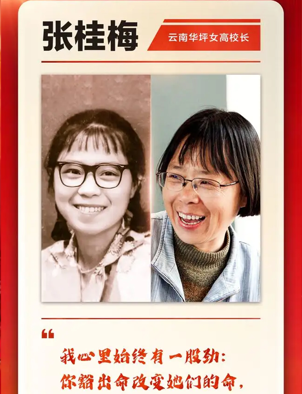 个人简介 张桂梅,原名张玫瑰 ,女,满族,中共党员,1957年6月生于黑龙江省牡丹江市,原籍辽宁省岫岩满族自治县 ,1975年12月参加工作,1998年4月加入中国共产党,丽江华坪女子高级中学书记、校长,华坪县儿童福利院院长(义务兼任),丽江华坪桂梅助学会会长 。 2020年6月29日,被云南省委宣传部授予“云岭楷模”称号 ;12月3日,被中共中央授予“全国优秀共产党员”称号 ;12月10日,被中宣部授予时代楷模称号 ,先后荣获“全国先进工作者”“全国十佳师德标兵”“中国十大女杰”“全国精神文明十佳人物”“全国五一劳动奖章”“全国十佳知识女性”“中国十大教育年度人物”“全国百名优秀母亲”“全国最美乡村教师” “全国优秀教师”“全国三八红旗手”“全国教书育人楷模”等称号,党的十七大代表 。