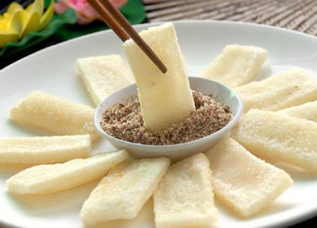 水糍粑,如趁出笼时热气腾腾,再裹上点白糖或熟豆粉,更是色美味鲜,口感细滑沁甜。桂林水糍粑是将上好糯米蒸熟后杵打成团后入笼蒸熟而成,里面要包上豆蓉、莲蓉、芝麻桂花糖等馅料,出笼时还要裹上些许白糖或熟豆粉,色泽晶莹洁白,口感细滑沁甜