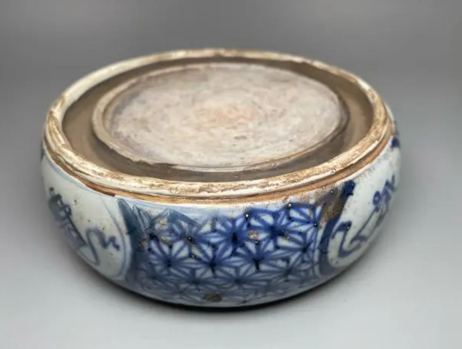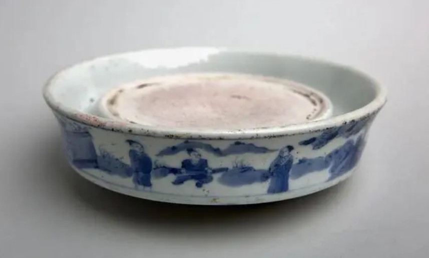 明崇祯青花人物故事纹圆瓷砚明崇祯青花人物故事纹圆瓷砚,直径15.2厘米,胎体厚重,但砚面胎质极为细腻,如同婴儿皮肤般滑嫩。砚面上尚有朱砂的残留痕迹,周边一圈是储水用的凹槽。青花发色淡雅,画工精到,砚外壁绘有三组人物故事图案,共有十个形象各昇的人物,或前仰后俯、或观望静听。远山近景、粉墙黛瓦描绘得都比较细致。尤其是括号云纹饰仿佛是在田野间弥漫的云雾,缭绕四周,极为飘逸流畅,这是崇祯瓷器的特有纹饰,别具一格。