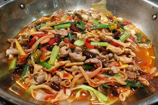 爆椒鸡杂是地道的川渝风味菜,鸡杂腥膻味重,将其与辣椒、泡椒和葱姜蒜同炒,既可以除去鸡杂的异味,还使成菜脆嫩鲜香、辣得人食欲大增。