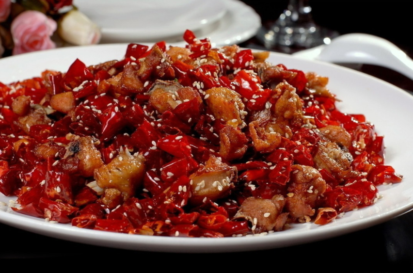 辣子鸡是重庆的一道特色菜。辣子鸡以麻辣为主,辣子鸡香气四溢,麻辣酥香,鸡肉外酥里嫩, 并且还带有芝麻的清香,辣中又带一点酥麻,是一个很值得体验的菜。