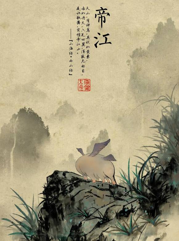 《山海经·西山次三经》:又西三百五十里曰天山……,有神鸟,其状如黄囊,赤如丹火,六足四翼,浑敦无面目,是识歌舞,实为帝江也。