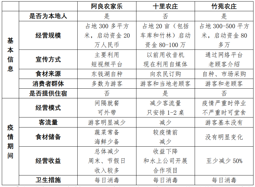 通过实地考察与对老板的采访,我们了解到,农家乐的菜品原料都是直接由当地农户种植采购,安全、卫生便是农家乐竞争的重要竞争优势,并且都有自身的特色菜品。环境贴近自然风景宜人,非常适合农村旅游等经济形式。 由于因地制宜的环境、丰富的农业资源和持续的游客资源,在无疫情影响下,农家乐具有很高的经济效益, 可以作为“乡村振兴”的重要方式。在疫情影响下,由于人流量的大幅下降和经营管理的巨大限制,即使在疫情势态稍缓的情况下, 经营效益有明显下降。我们还了解到,在疫情下老板们都积极配合疫情防控工作,做好基础卫生和每日消毒工作,减少人员聚集。 在非常时期起到了非常好的标杆作用。